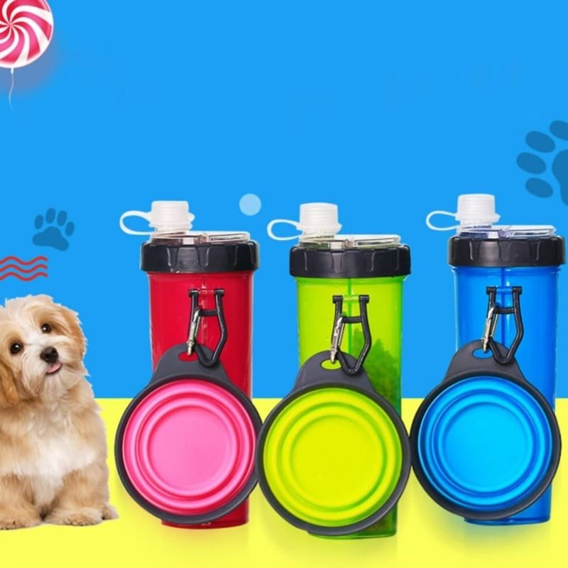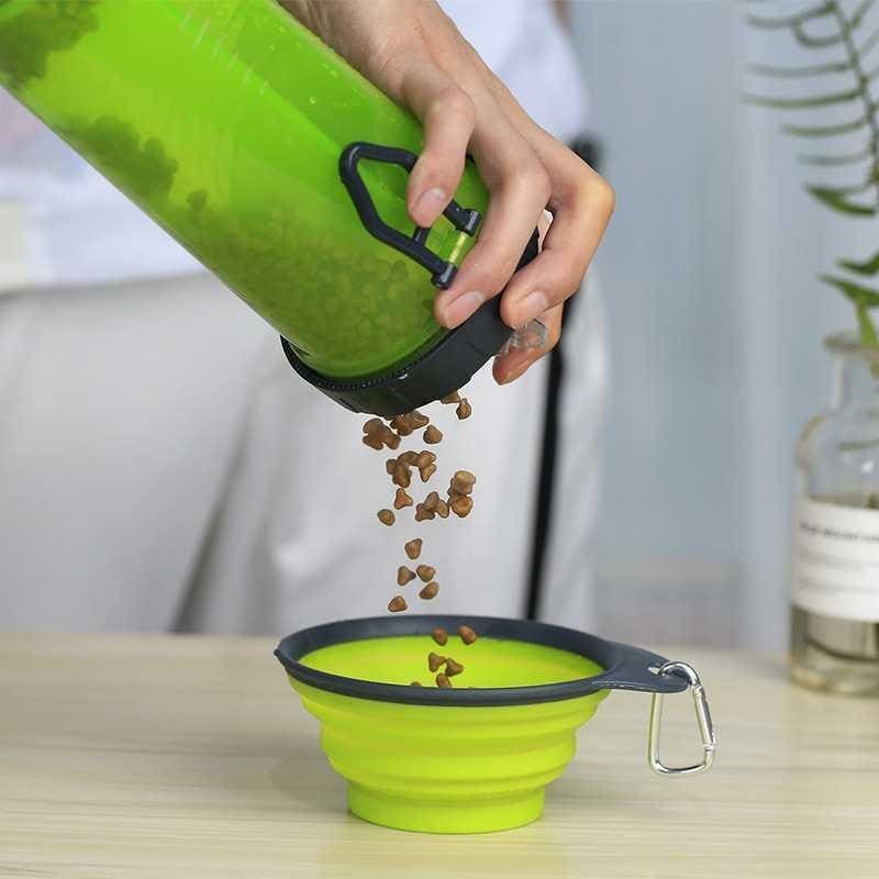 Botella de agua 2 en 1 para mascotas, contenedor de almacenamiento de alimentos. Fácil de llevar, no tiene fugas. Diseñado con dos cámaras en una botella, una para comida seca y la otra para agua. Con dos tapas de presión de boca ancha en la parte superior de la tapa, fácil de dispensar aperitivos o verter agua. Tapas de bloqueo integradas con juntas de silicona que sellan las botellas firmemente y protegen los alimentos del aire y el agua mientras los mantiene frescos. Las tapas a prueba de fugas evitan que el líquido se filtre. El tazón plegable para perro es de 12 oz, suficiente para caminar al aire libre, senderismo, viajar.