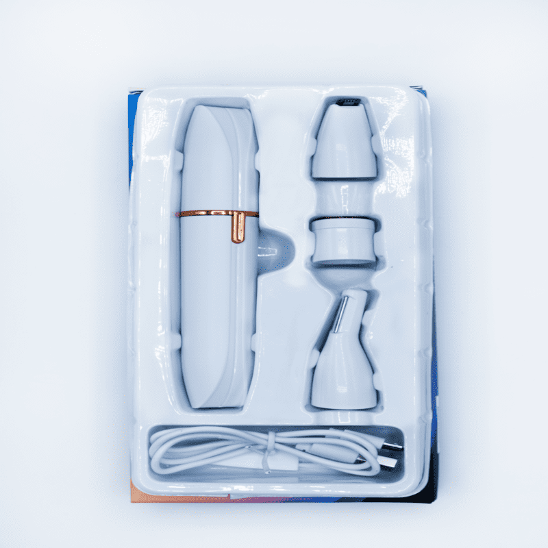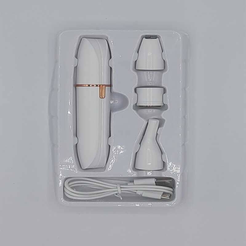 • 1 cuerpo del dispositivo principal con 4 cabezales reemplazables diseñados con varias funciones: un cabezal de depilación, un cabezal de corte de pelo de nariz, un cabezal de corte de pelo, Y un cabezal de corte de cejas. 4 cuchillas lavables y reemplazables, puede quitar y enjuagar las cuchillas después de su uso, saludable e higiénico.