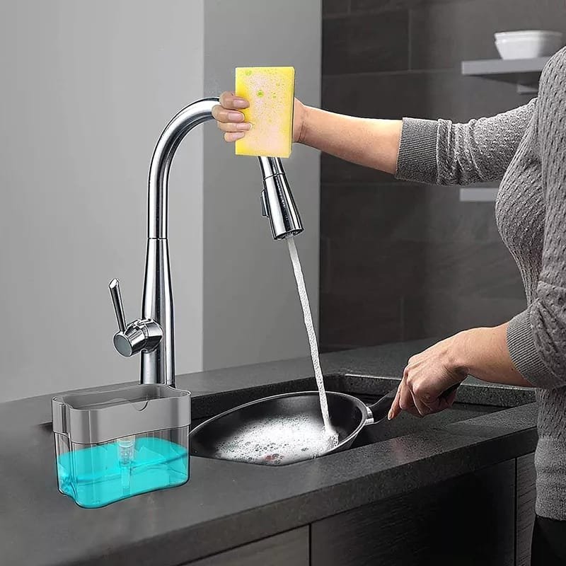 - Diseño 2 en 1: dispensador de jabón y caddy, funcionamiento con una sola mano. puede usarlo para sujetar esponjas, depuradores, trapos, almohadillas de fregado en un lugar conveniente mientras mantiene el agua fuera de los mostradores de cocina.