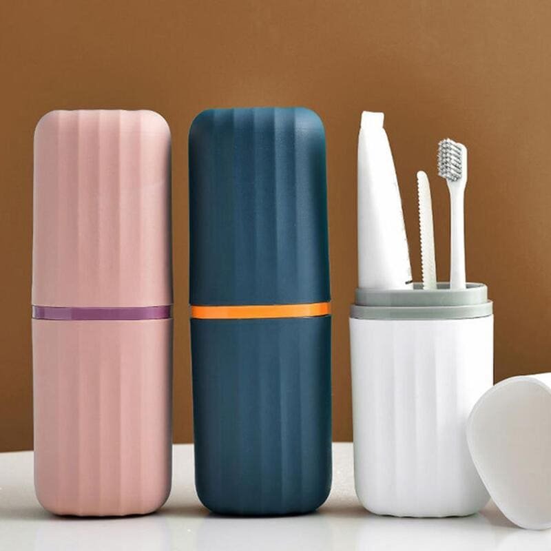 - Estuche portátil para cepillos de dientes, composición de dos vasos los cuales se adaptan perfectamente para ahorrar espacio