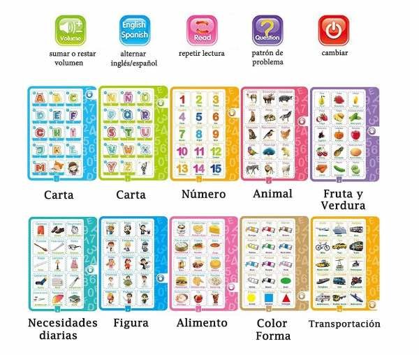 – Para el aprendizaje de letras, mural de cuadros y palabras, con música maravillosa que acompaña a tu niño o niña durante toda la experiencia, control táctil.